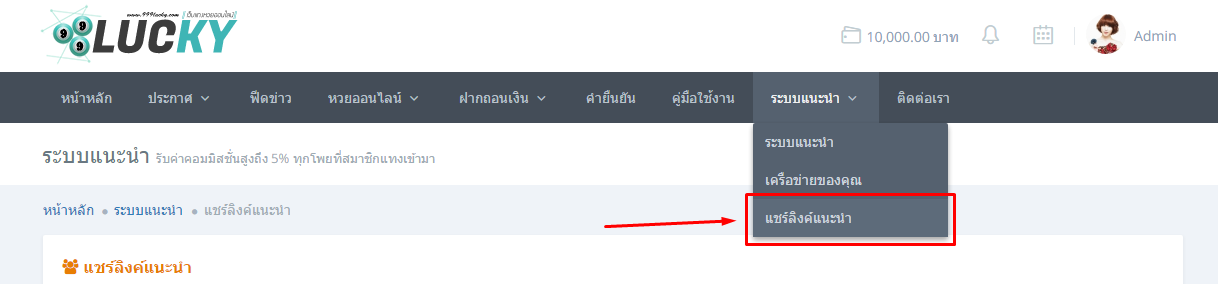 หากคุณต้องการแนะนำคนอื่นเพื่อมาเป็นสมาชิกของคุณ ไปที่เมนู แชร์ลิงค์แนะนำ จะแสดงลิงค์ไว้ให้คุณสามารถแชร์ได้