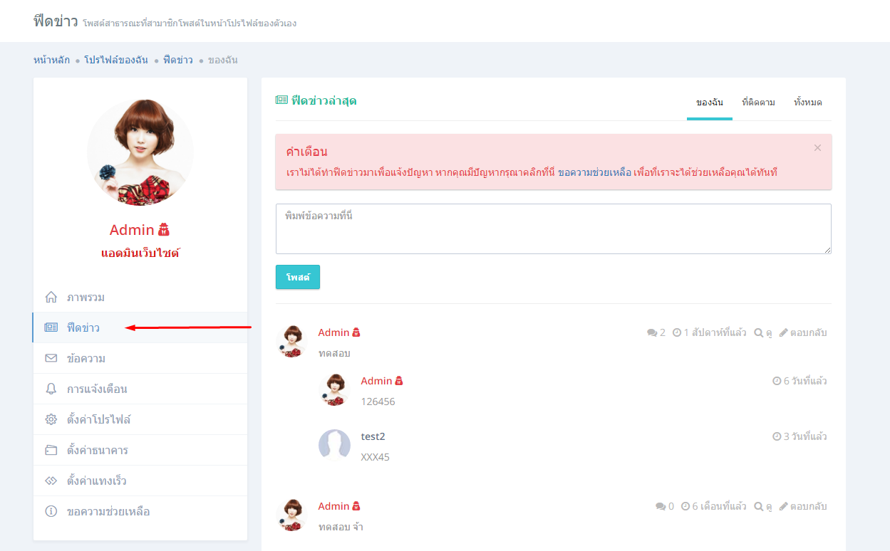 คลิกที่เมนูด้านซ้ายมือ เลือกฟีดข่าว จะพบหน้าโพสต์ฟีดข่าวของคุณเอง