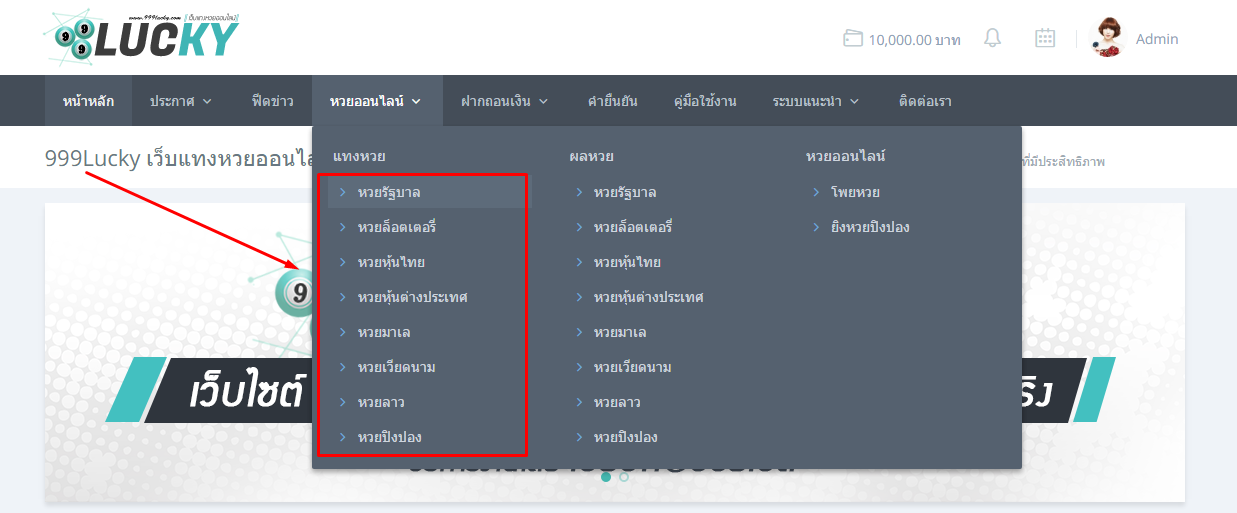 คลิกที่เมนูเลือก หวยออนไลน์ > แทงหวย