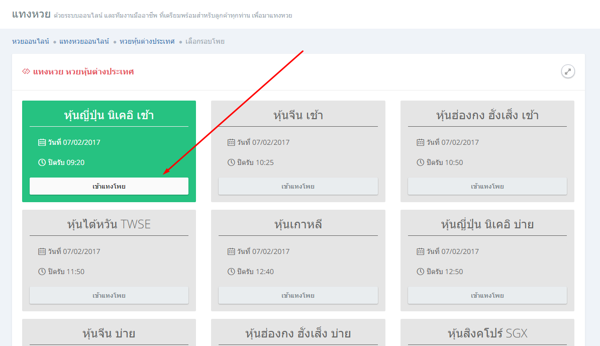 เลือกห้องหวยที่จะแทง สีเขียวคือหวยที่เปิดรับแทง ณ ตอนนั้น